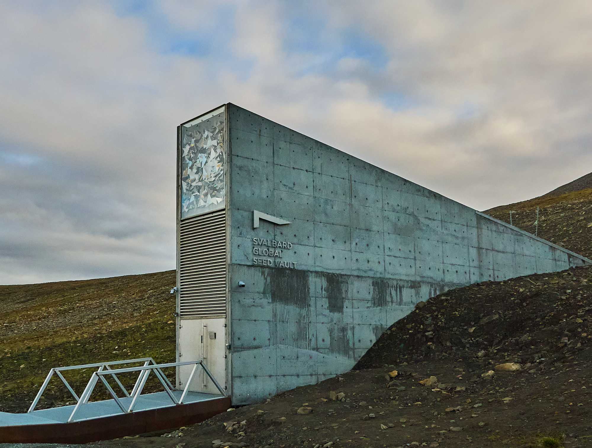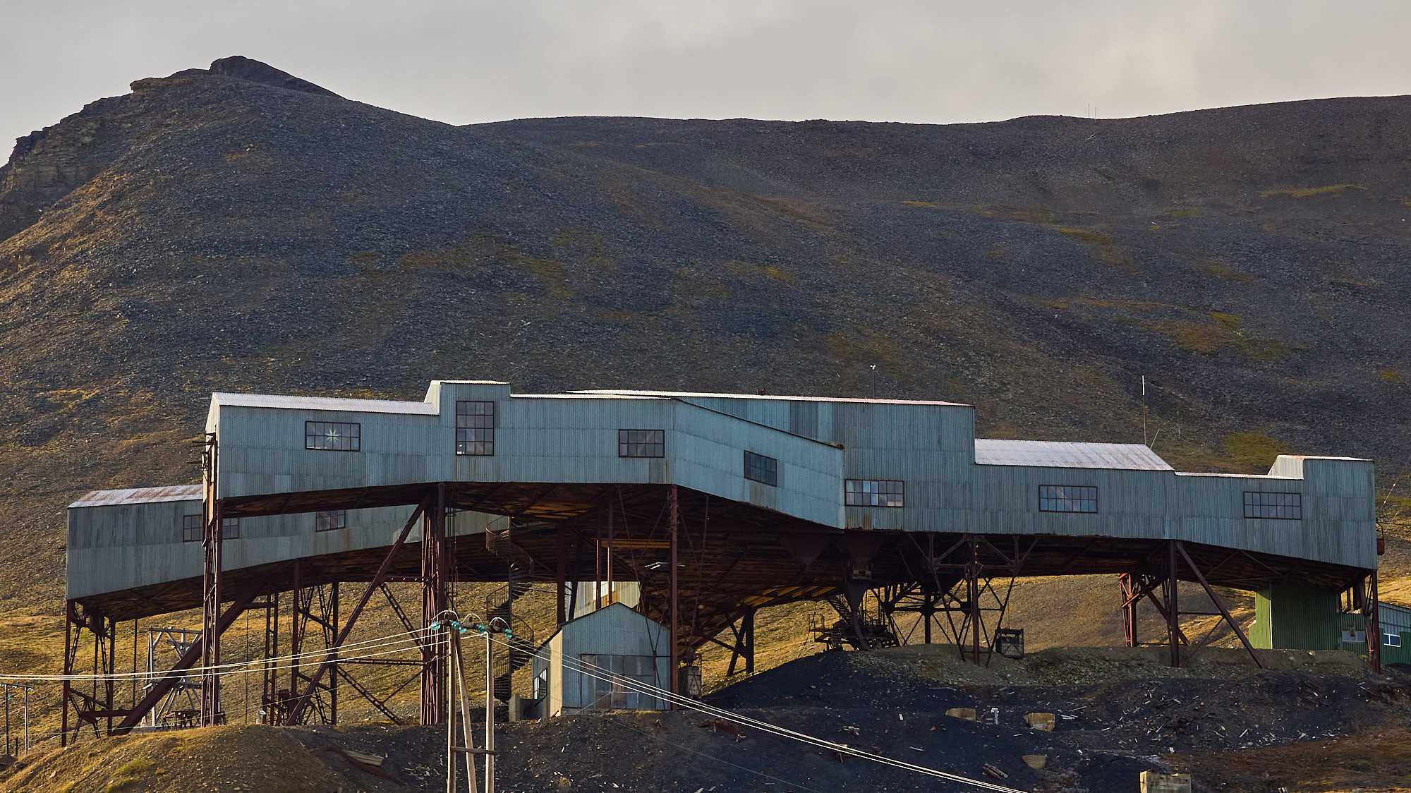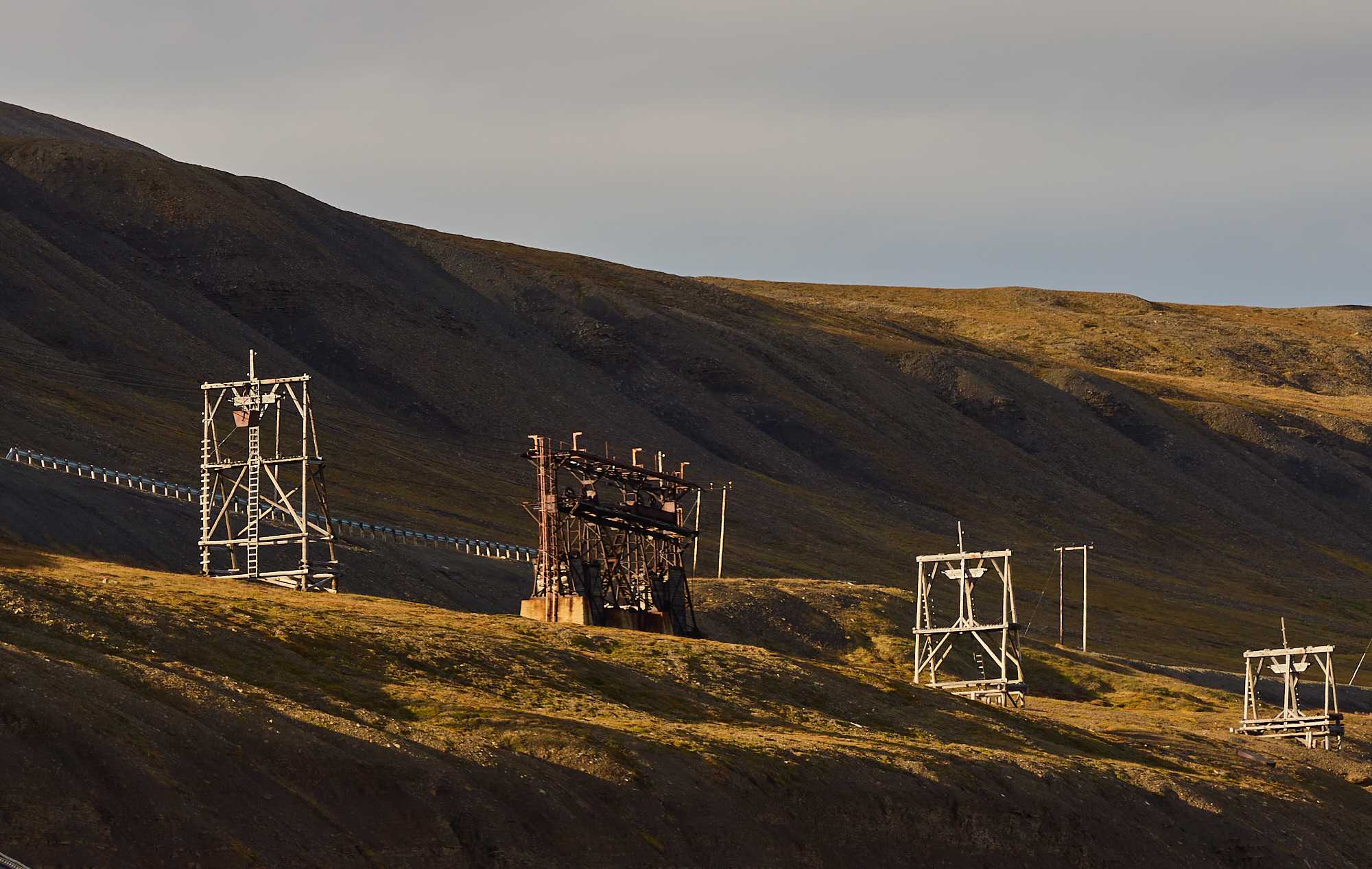 The cable building for the iron ore buckets Towers for iron ore buckets Various mountain sides, some showing legacy mine entrances The Svalbard Global Seed Vault. Owned & operated by Norway for humanity