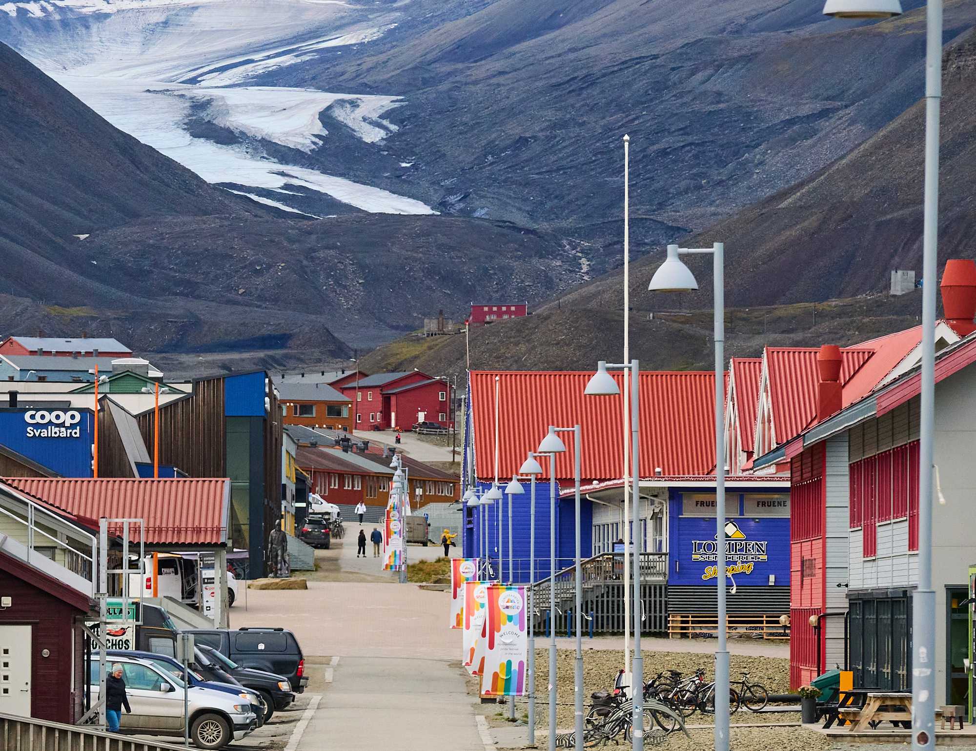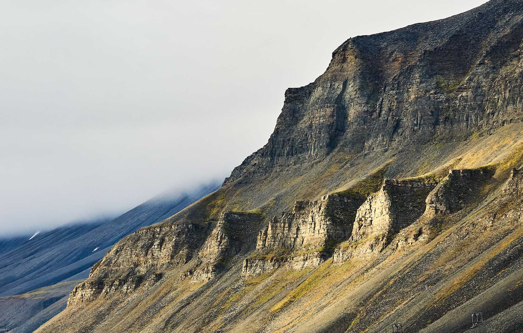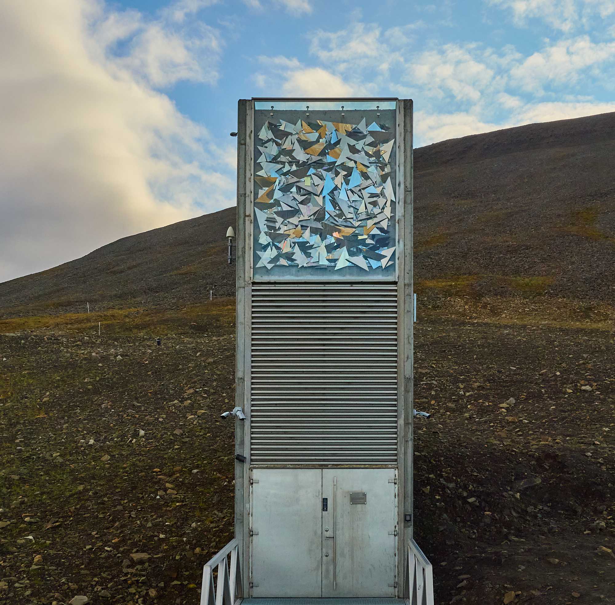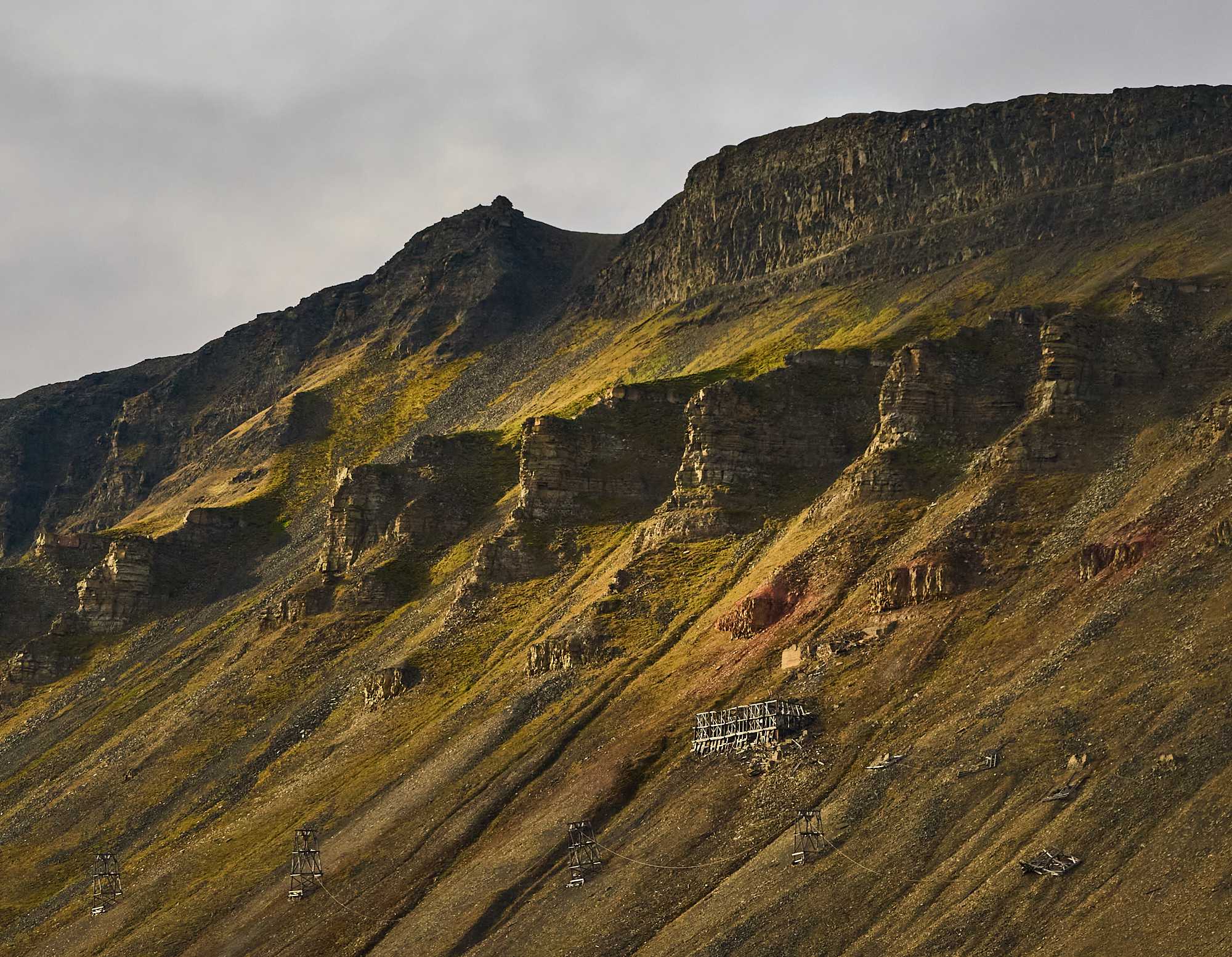 The cable building for the iron ore buckets Towers for iron ore buckets Various mountain sides, some showing legacy mine entrances The Svalbard Global Seed Vault. Owned & operated by Norway for humanity