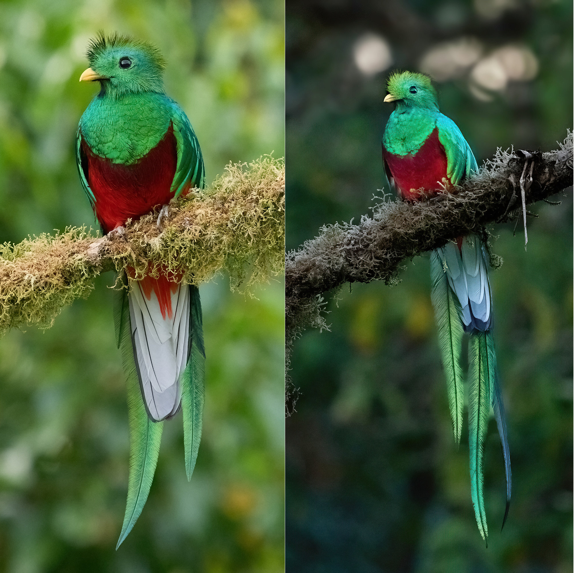 #33 montage of female and male quetzals from 2 separate days (PM and AM, respectively). The right panel will be re-processed. Left: 1/5000, F6.3, ISO1600, 750mm. Right: 1/320, F4.5, ISO1600, 512mm